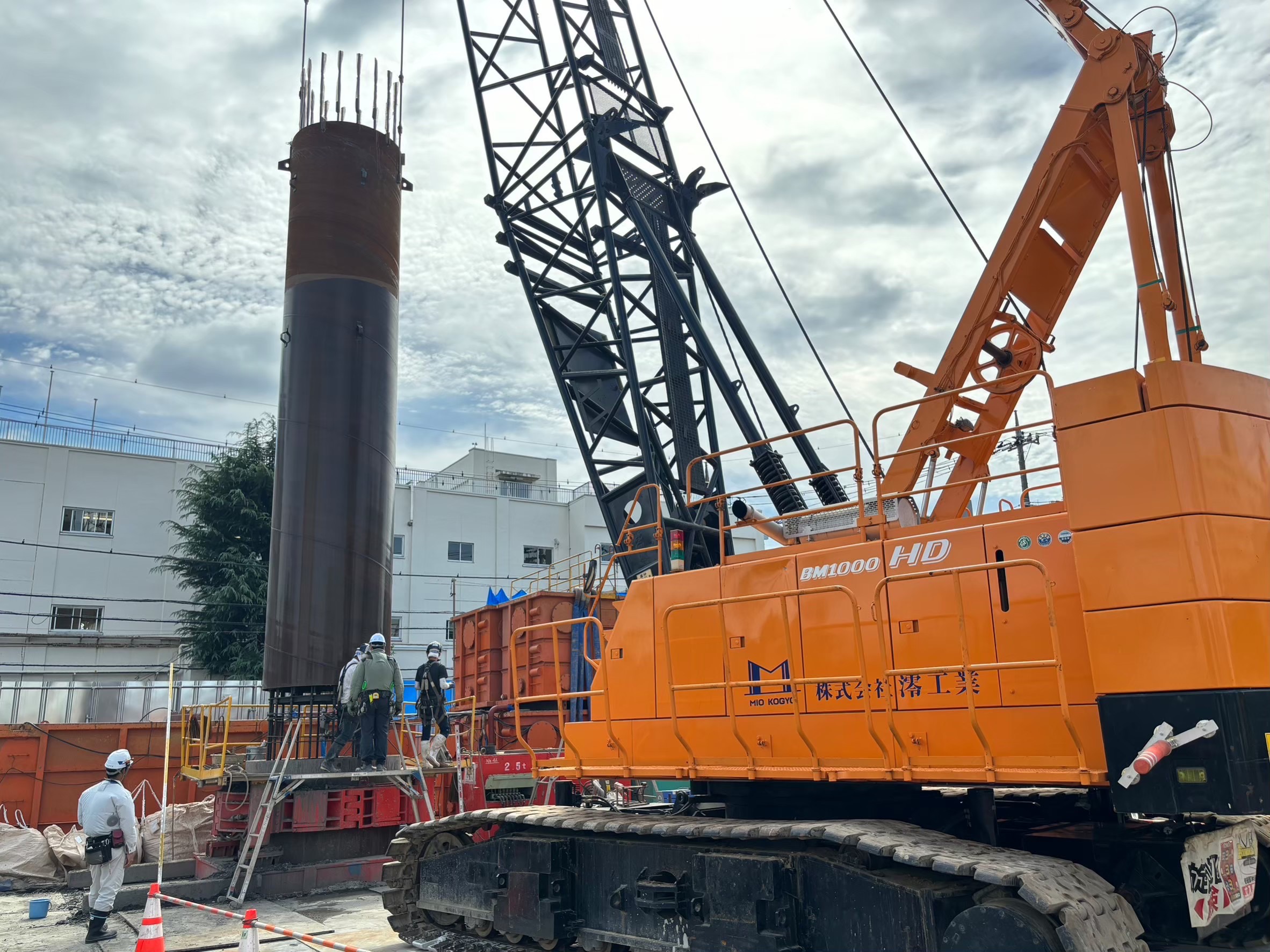 オールケーシング工法とは、ケーシングチューブを掘削孔全長にわたり回転圧入しながら地盤に圧入、切削しケーシングチューブ内の土砂をハンマーグラブで掘削、排土を行っていきます。
